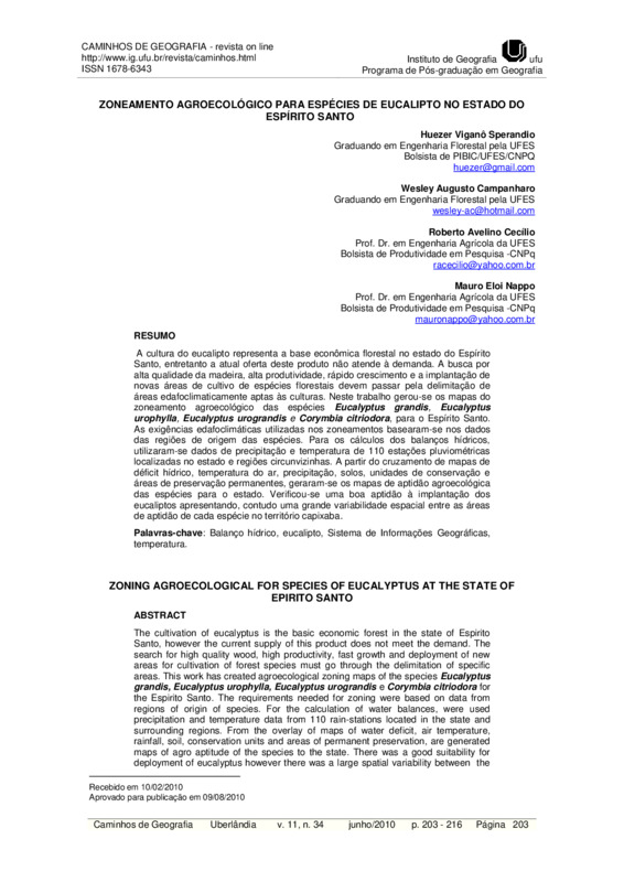 A cultura do eucalipto representa a base econômica florestal no estado do Espírito Santo, entretanto a atual oferta deste produto não atende à demanda. A busca por alta qualidade da madeira, alta produtividade, rápido crescimento e a implantação de novas áreas de cultivo de espécies florestais devem passar pela delimitação de áreas edafoclimaticamente aptas às culturas. Neste trabalho gerou-se os mapas do zoneamento agroecológico das espécies Eucalyptus grandis, Eucalyptus urophylla, Eucalyptus urograndis e Corymbia citriodora, para o Espírito Santo. As exigências edafoclimáticas utilizadas nos zoneamentos basearam-se nos dados das regiões de origem das espécies. Para os cálculos dos balanços hídricos, utilizaram-se dados de precipitação e temperatura de 110 estações pluviométricas localizadas no estado e regiões circunvizinhas. A partir do cruzamento de mapas de déficit hídrico, temperatura do ar, precipitação, solos, unidades de conservação e áreas de preservação permanentes, geraram-se os mapas de aptidão agroecológica das espécies para o estado. Verificou-se uma boa aptidão à implantação dos eucaliptos apresentando, contudo uma grande variabilidade espacial entre as áreas de aptidão de cada espécie no território capixaba.