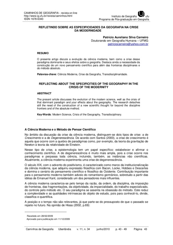 REFLETINDO SOBRE AS ESPECIFICIDADES DA GEOGRAFIA NA CRISE DA MODERNIDADE