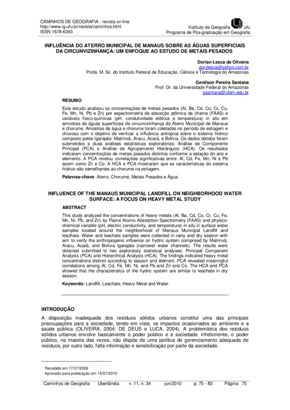 Este estudo analisou as concentrações de metais pesados (Al, Ba, Cd, Co, Cr, Cu, Fe, Mn, Ni, Pb e Zn) por espectrometria de absorção atômica de chama (FAAS) e variáveis físico-químicas (pH, condutividade elétrica e temperatura) in situ em amostras de águas superficiais da circunvizinhança do Aterro Municipal de Manaus e chorume. Amostras de água e chorume foram coletadas no período de estiagem e chuvoso com o objetivo de verificar a influência antrópica sobre o sistema hídrico composto pelos Igarapés: Matrinxã, Aracu, Acará, e Bolívia. Os dados obtidos foram submetidos a duas análises estatísticas exploratórias: Análise de Componente Principal (PCA) e Análise de Agrupamento Hierárquico (HCA). Os resultados indicaram concentrações de metais pesados distintos conforme a estação do ano e elemento. A PCA revelou correlações significativas entre: Al, Cd, Fe, Mn, Ni e Pb assim como Zn e Co. A HCA e PCA mostraram que as características do sistema hídrico são semelhantes ao chorume na estiagem.