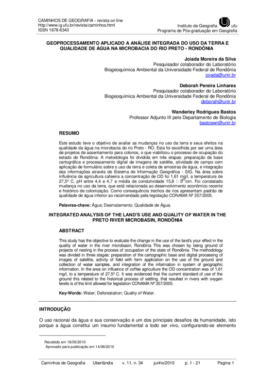 GEOPROCESSAMENTO APLICADO A ANÁLISE INTEGRADA DO USO DA TERRA E QUALIDADE DE ÁGUA NA MICROBACIA DO RIO PRETO – RONDÔNIA
