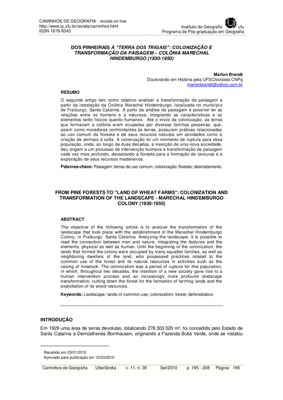 Dos Pinheirais a “terra dos Trigais”: Colonização e transformação da Paisagem - Colônia Marechal Hindemburgo (1930-1950) - FROM PINE FORESTS TO "LAND OF WHEAT FARMS": COLONIZATION AND TRANSFORMATION OF THE LANDSCAPE - MARECHAL HINDEMBURGO COLONY (1930-1950)