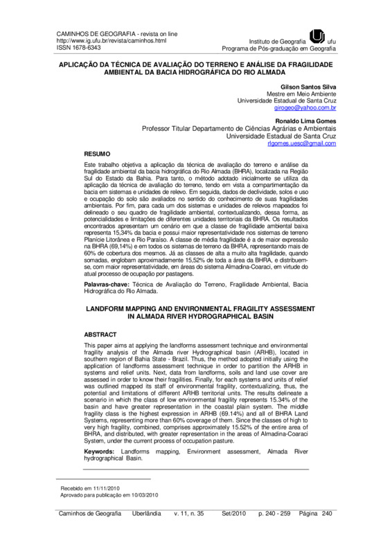 Aplicação da técnica de avaliação do terreno e análise da fragilidade ambiental da bacia hidrográfica do Rio Almada - LANDFORM MAPPING AND ENVIRONMENTAL FRAGILITY ASSESSMENT IN ALMADA RIVER HYDROGRAPHICAL BASIN