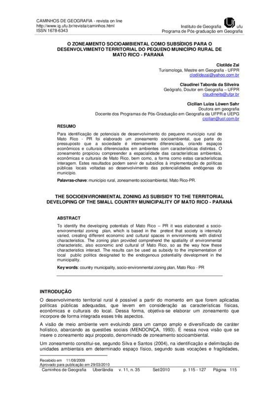 O zoneamento socioambiental como subsídios para o desenvolvimento territorial do pequeno município rural de Mato Rico - Paraná - THE SOCIOENVIRONMENTAL ZONING AS SUBISIDY TO THE TERRITORIAL DEVELOPING OF THE SMALL COUNTRY MUNICIPALITY OF MATO RICO - PARANÁ