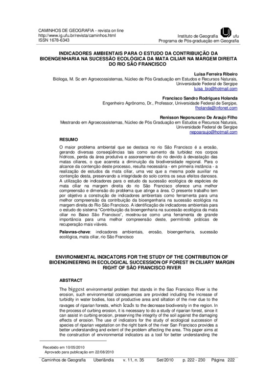 Indicadores ambientais para o estudo da contribuição da bioengenharia na sucessão ecológica da Mata Ciliar na margem direita do Rio São Francisco - ENVIRONMENTAL INDICATORS FOR THE STUDY OF THE CONTRIBUTION OF BIOENGINEERING IN ECOLOGICAL SUCCESSION OF FOREST IN CILIARY MARGIN RIGHT OF SÃO FRANCISCO RIVER