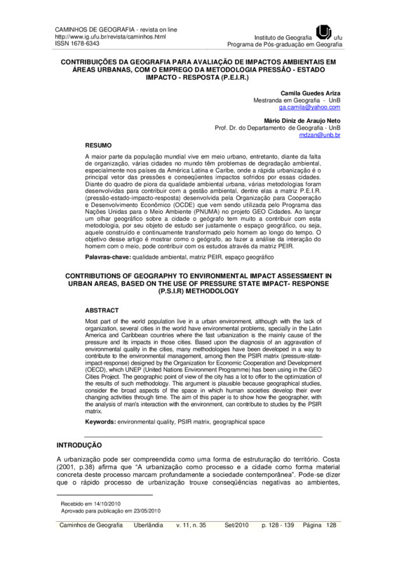 Contribuições da Geografia para Avaliação de Impactos Ambientais em Áreas Urbanas, com o Emprego da Metodologia Pressão - Estado Impacto- Resposta (P.E.I.R.) - CONTRIBUTIONS OF GEOGRAPHY TO ENVIRONMENTAL IMPACT ASSESSMENT IN URBAN AREAS, BASED ON THE USE OF PRESSURE STATE IMPACT- RESPONSE (P.S.I.R) METHODOLOGY