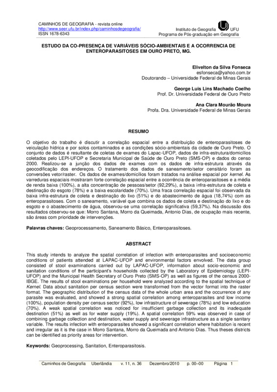ESTUDO DA CO-PRESENÇA DE VARIÁVEIS SÓCIO-AMBIENTAIS E A OCORRENCIA DE ENTEROPARASITOSES EM OURO PRETO, MG.