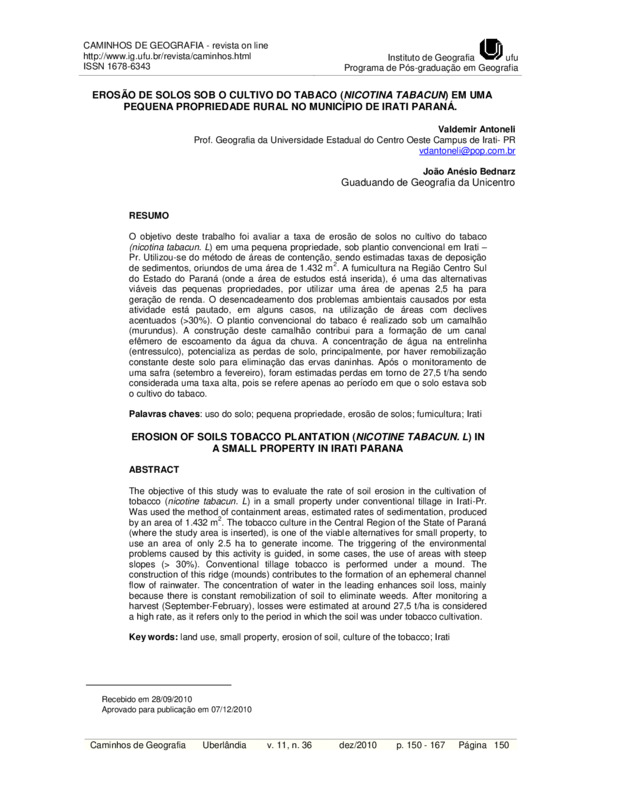 EROSÃO DE SOLOS NO CULTIVO DE TABACO (NICOTINA TABACUN) EM UMA PEQUENA PROPRIEDADE RURAL NO MUNICÍPIO DE IRATI PARANÁ.