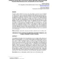 O objetivo deste trabalho, foi avaliar a taxa de erosão de solos no cultivo do tabaco (nicotina tabacun. L) em uma pequena propriedade, sob plantio convencional em Irati –Pr. Utilizou-se do método de áreas de contenção, sendo estimadas taxas de deposição de sedimentos, oriundos de uma área de 1.432 m2. A fumicultura na Região Centro Sul do Estado do Paraná (onde a área de estudos está inserida), é uma das alternativas viáveis das pequenas propriedades, por utilizar uma área de apenas 2,5 ha para geração de renda. O desencadeamento dos problemas ambientais causados por esta atividade está pautado, em alguns casos, na utilização de áreas com declives acentuados (>30%). O plantio convencional do tabaco é realizado sob um camalhão (murundus). A construção deste camalhão contribui para a formação de um canal efêmero de escoamento da água da chuva. A concentração de água na entrelinha (entressulco), potencializa as perdas de solo, principalmente, por haver remobilização constante deste solo para eliminação das ervas daninhas. Após o monitoramento de uma safra (setembro a fevereiro), foram estimadas perdas em torno de 27,58 t/ha sendo considerada uma taxa alta, pois se refere apenas ao período em que o solo estava sob o cultivo do tabaco.
