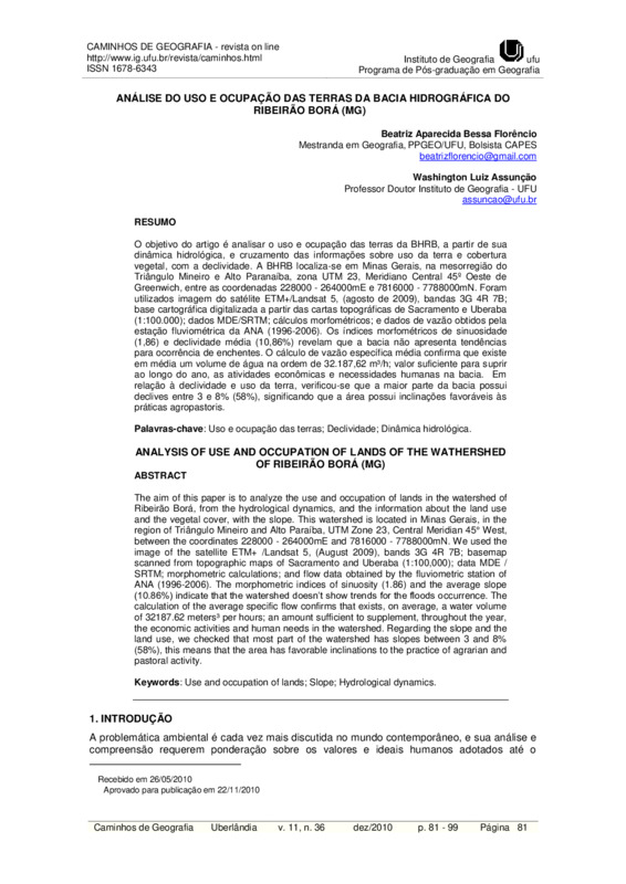 ANÁLISE DO USO E OCUPAÇÃO DAS TERRAS DA BACIA HIDROGRÁFICA DO RIBEIRÃO BORÁ (MG)