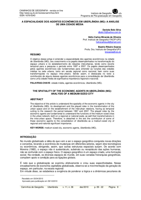 A ESPACIALIDADE DOS AGENTES ECONÔMICOS EM UBERLÂNDIA (MG): A ANÁLISE DE UMA CIDADE MÉDIA