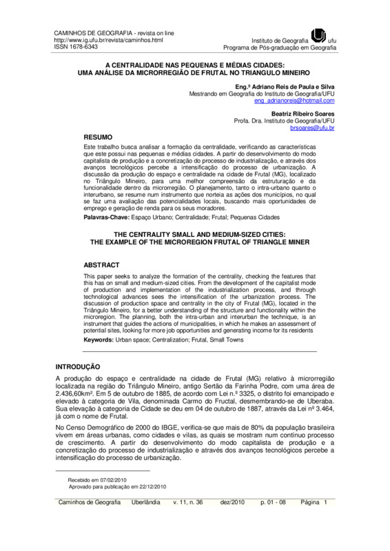 A CENTRALIDADE NAS PEQUENAS E MÉDIAS CIDADES: UMA ANÁLISE DA MICRORREGIÃO DE FRUTAL NO TRIANGULO MINEIRO