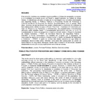 Este trabalho objetivou-se a mostrar algumas políticas públicas de prevenção e combate à criminalidade envolvendo jovens no Brasil e, especificamente, no Estado de Minas Gerais. A metodologia utilizada consistiu-se na abordagem dos conceitos relacionados aos seguintes temas: 1) Políticas Públicas e Programas Sociais de Prevenção à violência no Brasil; 2) Programa de Medidas Socioeducativas para os jovens. Além disso, percebeu-se que há programas sociais voltados para a prevenção da violência na faixa etária jovem, dentre os quais o Projeto “Fica Vivo”, implantado em Uberlândia por meio do Programa de Prevenção à Criminalidade. Os procedimentos metodológicos utilizados neste trabalho foram: 1) Levantamento bibliográfico referente ao tema; 2) Levantamento de dados em programas e órgãos públicos, como: o Programa Nacional de Direitos Humanos – PNDH, da Secretaria Nacional de Segurança Pública – SENASP; a Polícia Comunitária, que trabalha em conjunto com a população, as instituições de segurança pública e a defesa social; o Centro de Estudos de Segurança e Cidadania – CESEC. A partir da análise dos dados constatou-se que todas as estratégias desenvolvidas pelas referidas instituições têm assegurado ao jovem os meios básicos de segurança, educação, saúde, lazer e trabalho na sociedade, atuando diretamente na redução da população jovem envolvida em crimes.
