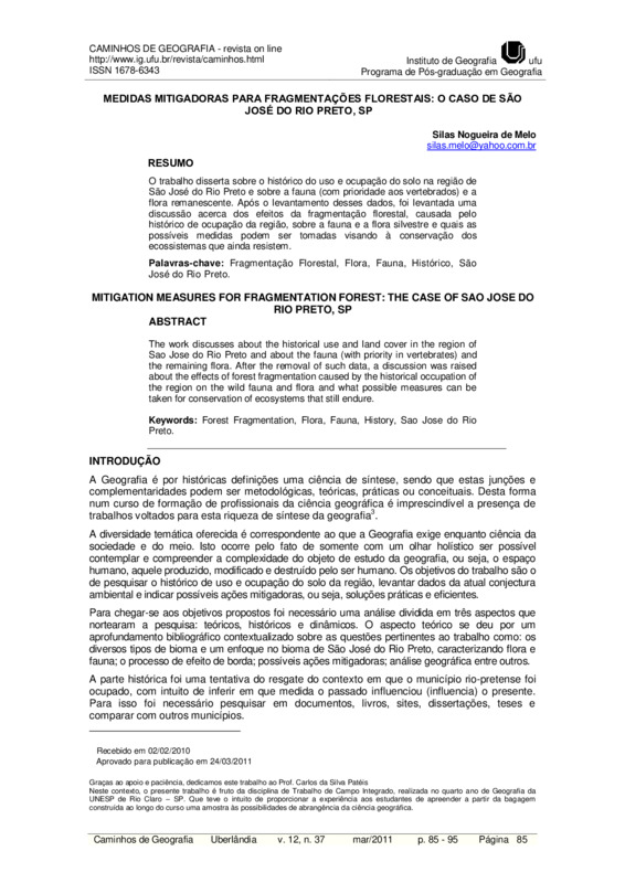 MEDIDAS MITIGADORAS PARA FRAGMENTAÇÕES FLORESTAIS: O CASO DE SÃO JOSÉ DO RIO PRETO, SP