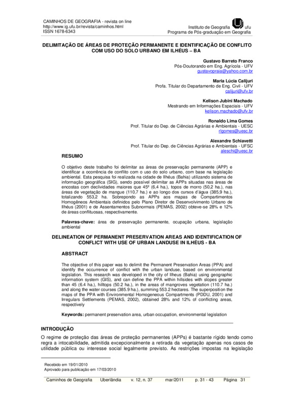 O objetivo deste trabalho foi delimitar as áreas de preservação permanente (APP) e identificar a ocorrência de conflito com o uso do solo urbano, com base na legislação ambiental. Esta pesquisa foi realizada na cidade de Ilhéus (Bahia) utilizando sistema de informação geográfica (SIG), sendo possível delimitar as APPs situadas nas áreas de encostas com declividades maiores que 45º (6,4 ha.), topos de morro (50,2 ha.), nas áreas de vegetação de mangue (110,7 ha.) e ao longo dos cursos d’água (385,9 ha.), totalizando 553,2 ha. Sobrepondo as APPs aos mapas de Compartimentos Homogêneos Ambientais definidos pelo Plano Diretor de Desenvolvimento Urbano de Ilhéus (2001) e de Assentamentos Subnormais (PEMAS, 2002) obteve-se 28% e 12% de áreas conflituosas, respectivamente.