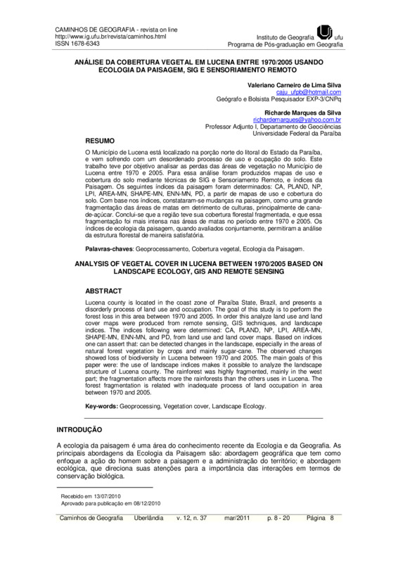 O Município de Lucena está localizado na porção norte do litoral do Estado da Paraíba, e vem sofrendo com um desordenado processo de uso e ocupação do solo. O objetivo deste trabalho foi analisar as perdas das áreas de vegetação no Município de Lucena entre 1970 e 2005. Para essa análise foram produzidos mapas de uso e cobertura do solo, aplicação de índices de ecologia da paisagem para o período estudado. Os seguintes índices de ecologia da paisagem foram determinados: CA, PLAND, NP, LPI, AREA-MN, SHAPE-MN, ENN-MN, PD. Com base nos mapas de uso e cobertura do solo e nos índices, pode-se constatar que houve mudanças na paisagem, como uma grande fragmentação das áreas de matas em detrimento de culturas, principalmente a de cana-de-açúcar. As alterações observadas demonstram que houve uma notável perda de biodiversidade no município de Lucena no período entre 1970 e 2005. Conclui-se que os índices de ecologia da paisagem, quando avaliados conjuntamente, permitiram a análise da estrutura florestal da bacia de maneira satisfatória. A região teve sua cobertura florestal fragmentada e que essa fragmentação foi mais intensa nas áreas de matas no período entre 1970 e 2005.