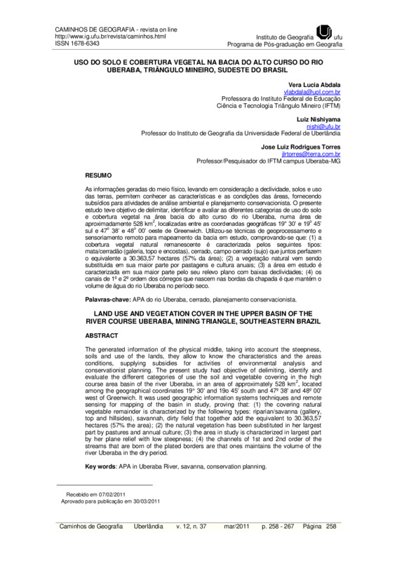 USO DO SOLO E COBERTURA VEGETAL NA BACIA DO ALTO CURSO DO RIO UBERABA