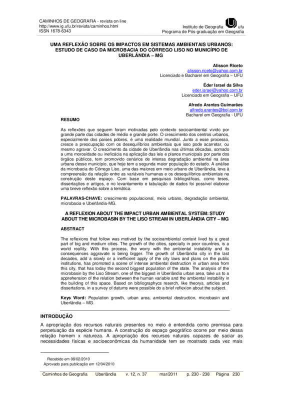 UMA REFLEXÃO SOBRE OS DESEQUILIBRIOS EM SISTEMAS AMBIENTAIS URBANOS: ESTUDO DE CASO DA MICROBACIA DO CÓRREGO LISO NO MUNICÍPIO DE UBERLÂNDIA – MG