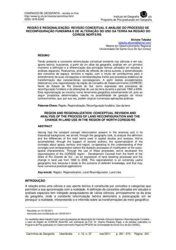 Tendo presente a constante reformulação conceitual existente nas ciências e em seu aporte teórico, buscamos, a partir de um olhar da geografia, analisar em um primeiro momento a definição e a diferenciação dos principais termos utilizados em estudos e análises espaciais. Realizamos, através da reflexão de vários autores, a sistematização dos conceitos de espaço, território e região, com o intuito de contribuirmos para o entendimento de suas concepções e reinterpretações frente aos processos dialéticos de transformação das características socioespaciais. A partir destes procedimentos elaboramos uma regionalização da região do Conselho de Desenvolvimento (COREDE) Norte do Estado do Rio Grande do Sul, como expressão dos processos de reconfiguração fundiária e de alterações do uso da terra durante o período 1992 a 2006. Esta regionalização se constitui numa ferramenta geográfica extremamente útil, pois ao seguir propósitos determinados, resulta na possibilidade de geração de novos conhecimentos, que, por sua vez, podem originar numerosas aplicações práticas.