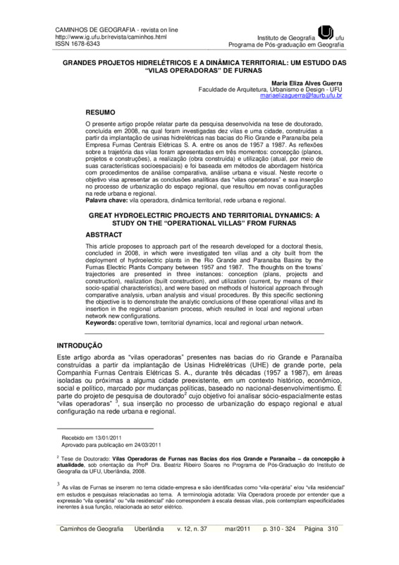 O presente artigo propõe relatar parte da pesquisa desenvolvida na tese de doutorado, concluída em 2008, na qual foram investigadas dez vilas e uma cidade, construídas a partir da implantação de usinas hidrelétricas nas bacias do Rio Grande e Paranaíba pela Empresa Furnas Centrais Elétricas S. A. entre os anos de 1957 a 1987. As reflexões sobre a trajetória das vilas foram apresentadas em três momentos: concepção (planos, projetos e construções), a realização (obra construída) e utilização (atual, por meio de suas características socioespaciais) e foi baseada em métodos de abordagem histórica com procedimentos de análise comparativa, análise urbana e visual. Neste recorte o objetivo visa apresentar as conclusões analíticas das “vilas operadoras” e sua inserção no processo de urbanização do espaço regional, que resultou em novas configurações na rede urbana e regional.