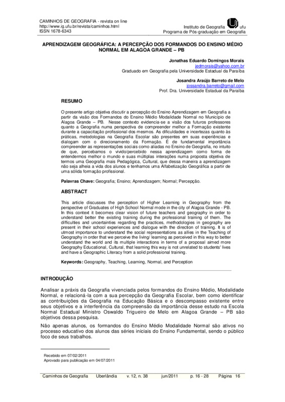 APRENDIZAGEM GEOGRÁFICA: A PERCEPÇÃO DOS FORMANDOS DO ENSINO MÉDIO NORMAL EM ALAGOA GRANDE – PB