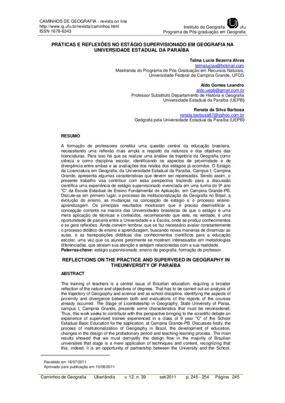 A formação de professores constitui uma questão central da educação brasileira, necessitando uma reflexão mais ampla a respeito da natureza e dos objetivos das licenciaturas. Para isso há que se realizar uma análise da trajetória da Geografia como ciência e como disciplina escolar, identificando os aspectos de proximidade e de divergência entre ambas e as avaliações dos relatos dos estágios já ocorridos. O Estágio da Licenciatura em Geografia, da Universidade Estadual da Paraíba, Campus I, Campina Grande, apresenta algumas características que devem ser repensadas. Sendo assim, o presente trabalho visa contribuir com essa perspectiva trazendo para a discussão científica uma experiência de estágio supervisionado vivenciada em uma turma do 9º ano “C” da Escola Estadual de Ensino Fundamental de Aplicação, em Campina Grande-PB. Discute-se em primeiro lugar, o processo de institucionalização da Geografia no Brasil, a evolução do ensino, as mudanças na concepção de estágio e o processo ensino-aprendizagem. Os principais resultados mostraram que é preciso desmistificar a concepção corrente na maioria das Universidades brasileiras de que o estágio é uma mera aplicação de técnicas e conteúdos, reconhecendo que este, na verdade, é uma oportunidade de parceria entre a Universidade e a Escola, onde se produz conhecimentos e se gera reflexões. Ainda convém lembrar, que se faz necessário avaliar constantemente o processo didático de ensino e aprendizagem, buscando novas maneiras de dinamizar as aulas, e as transposições didáticas dos conhecimentos científicos para a educação escolar, uma vez que os alunos geralmente se mostram interessados em metodologias diferenciadas, que atraiam sua atenção e estejam relacionadas com a sua realidade.