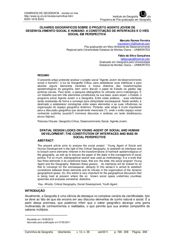 Olhares geográficos sobre o Projeto Agente Jovem de Desenvolvimento Social e Humano: a constituição de interfaces e o viés social em perspectiva
