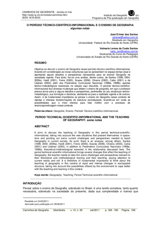 Objetiva-se discutir o ensino de Geografia nesse período técnico-científico-informacional, levando em consideração as novas conjunturas que se apresentam no espaço-tempo atual e apontando alguns desafios e perspectivas necessários para se ensinar Geografia na sociedade vigente. Para tanto, fez-se uma análise, dentre outros, de Santos (1999; 2004; 2009), Haidt (2001), Freire (2000), Soares (2006), Oliveira (2003), Callai (2001) e de Libâneo (2006), além dos Parâmetros Curriculares Nacionais (1998a; 1998b), aportes teórico-metodológicos essenciais na relação aqui discutida. O período técnico-científico-informacional traz diversas mudanças que afetam o ensino de geografia, em que o professor precisa tomar para si alguns desafios e perspectivas, pertinentes ao seu arcabouço teórico-metodológico, sua formação e docência, atentando-se para a realidade vigente e de outrora. Assim, é de fundamental importância se pensar o ensino de Geografia nesse contexto de rápidas e intensas transformações da estrutura socioespacial, levando-se em conta as possibilidades que o meio oferece para lidar melhor com o processo de ensino/aprendizagem nesse contexto.