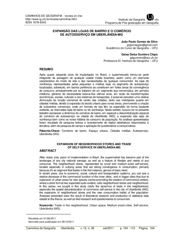 EXPANSÃO DAS LOJAS DE BAIRRO E O COMÉRCIO DE AUTOSSERVIÇO EM UBERLÂNDIA-MG