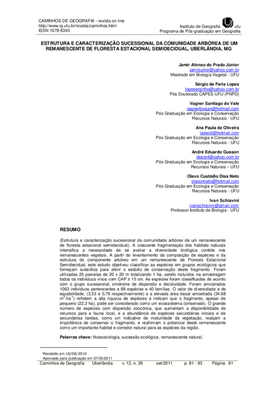 ESTRUTURA E CARACTERIZAÇÃO SUCESSIONAL DA COMUNIDADE ARBÓREA DE UM REMANESCENTE DE FLORESTA ESTACIONAL SEMIDECIDUAL, UBERLÂNDIA, MG