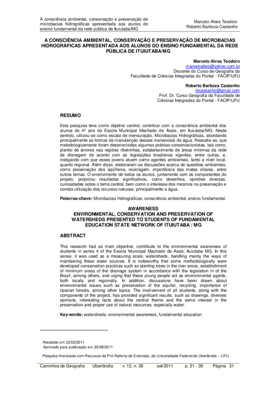 A CONSCIÊNCIA AMBIENTAL, CONSERVAÇÃO E PRESERVAÇÃO DE MICROBACIAS HIDROGRÁFICAS APRESENTADA AOS ALUNOS DO ENSINO FUNDAMENTAL DA REDE PÚBLICA DE ITUIUTABA/MG