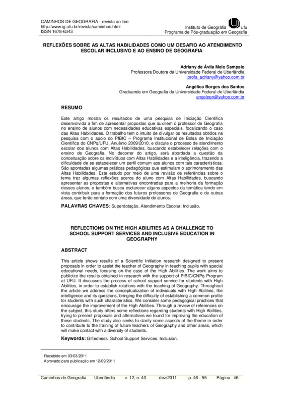 Este artigo mostra os resultados de uma pesquisa de Iniciação Científica desenvolvida a fim de apresentar propostas que auxiliem o professor de Geografia no ensino de alunos com necessidades educativas especiais, focalizando o caso das Altas Habilidades. O trabalho tem o intuito de divulgar os resultados obtidos na pesquisa com o apoio do PIBIC – Programa Institucional de Bolsa de Iniciação Científica do CNPq/UFU, Anuênio 2009/2010, e discute o processo de atendimento escolar dos alunos com Altas Habilidades, buscando estabelecer relações com o ensino de Geografia. No decorrer do artigo, será abordada a questão da conceituação sobre os indivíduos com Altas Habilidades e a inteligência, trazendo a dificuldade de se estabelecer um perfil comum aos alunos com tais características. São apontadas algumas práticas pedagógicas que estimulam o aprimoramento das Altas Habilidades. Este estudo por meio de uma revisão de referências sobre o tema traz algumas reflexões acerca do aluno com Altas Habilidades, buscando apresentar as propostas e alternativas encontradas para a melhoria da formação desses alunos, e também busca esclarecer alguns aspectos da temática tendo em vista contribuir para a formação dos futuros professores de Geografia e de outras áreas, que terão contato com uma diversidade de alunos.