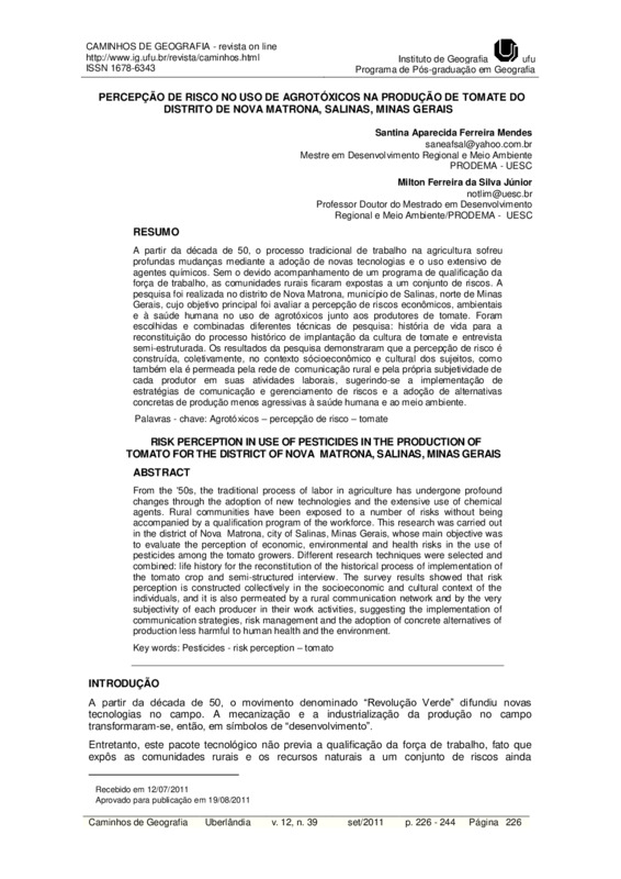 PERCEPÇÃO DE RISCO NO USO DE AGROTÓXICOS NA PRODUÇÃO DE TOMATE DO DISTRITO DE NOVA MATRONA, SALINAS, MINAS GERAIS.