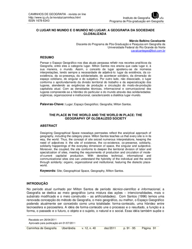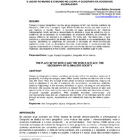 Pensar o Espaço Geográfico nos dias atuais perpassa refletir nos recortes analíticos da Geografia, entre eles a categoria lugar. Milton Santos nos ensina que cada lugar é, à sua maneira, o mundo. Assim, o conceito de lugar apoderou-se de inúmeras interpretações, tendo sempre a necessidade de adjetivá-lo: lugar da existência, da co-existência, da co-presença, da solidariedade, do acontecer solidário, da dimensão do espaço cotidiano, do singular e do subjetivo. Por outro lado, não dissociado, o lugar conforma o aprofundamento da divisão territorial do trabalho e da especialização dos lugares, atendendo as exigências de produção e circulação do modo-de-produção capitalista atual. Com as densidades técnicas, informacional e comunicacional dos lugares compreende-se a hibridez do particular e do mundo através das solidariedades: orgânicas, organizacional e institucional, caracterizando a dialética lugar-mundo.