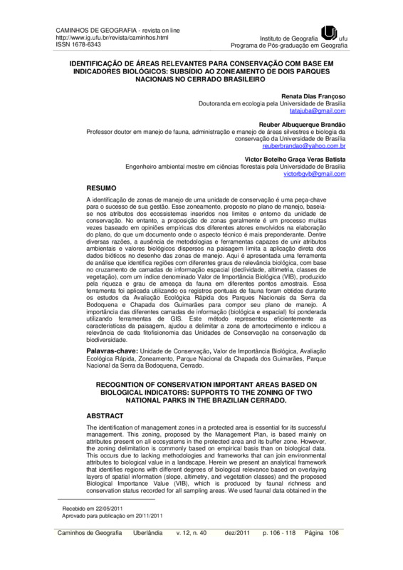 IDENTIFICAÇÃO DE ÁREAS RELEVANTES PARA CONSERVAÇÃO COM BASE EM INDICADORES BIOLÓGICOS: SUBSÍDIO AO ZONEAMENTO DE DOIS PARQUES NACIONAIS NO CERRADO BRASILEIRO