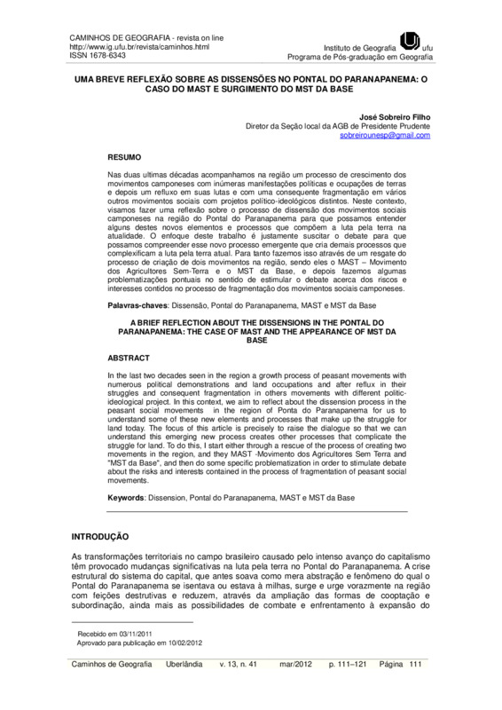 Nas duas ultimas décadas acompanhamos na região um processo de crescimento dos movimentos camponeses com inúmeras manifestações políticas e ocupações de terras e depois um refluxo em suas lutas e com uma consequente fragmentação em vários outros movimentos sociais com projetos político-ideológicos distintos. Neste contexto, visamos fazer uma reflexão sobre o processo de dissensão dos movimentos sociais camponeses na região do Pontal do Paranapanema para que possamos entender alguns destes novos elementos e processos que compõem a luta pela terra na atualidade. O enfoque deste trabalho é justamente suscitar o debate para que possamos compreender esse novo processo emergente que cria demais processos que complexificam a luta pela terra atual. Para tanto fazemos isso através de um resgate do processo de criação de dois movimentos na região, sendo eles o MAST – Movimento dos Agricultores Sem-Terra e o MST da Base, e depois fazemos algumas problematizações pontuais no sentido de estimular o debate acerca dos riscos e interesses contidos no processo de fragmentação dos movimentos sociais camponeses.