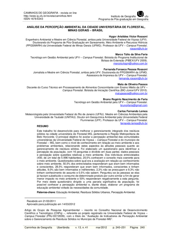 ANÁLISE DA PERCEPÇÃO AMBIENTAL DA CIDADE UNIVERSITÁRIA DE FLORESTAL, MINAS GERAIS – BRASIL