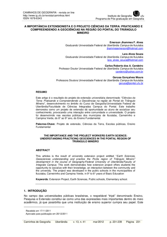 A IMPORTÂNCIA EXTENSIONISTA E O PROJETO CIÊNCIAS DA TERRA: PRATICANDO E COMPREENDENDO A GEOCIÊNCIAS NA REGIÃO DO PONTAL DO TRIÂNGULO MINEIRO