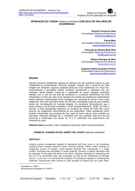 Liquens produzem substâncias capazes de interagir com seu substrato rochoso ou solo modificando-os quimicamente, formando quelatos. Quando sob a influência de fonte exógena de nitrogênio, algumas espécies produzem suas substâncias em maior teor, incrementando a percolação desses produtos, favorecendo a interação com seu substrato. Neste trabalho avaliou-se a capacidade do líquen Cladonia verticillaris interagir com o solo de sua área de ocorrência e, a possível interferência de fonte nitrogenada na forma de uréia como ativadora da síntese de substâncias modificadoras desse substrato. Experimentos foram montados com amostras do líquen e solo a elas subjacente, que foram periodicamente, até 150 dias, analisados a partir de seus extratos brutos por cromatografia em camada delgada. Os resultados demonstraram que o líquen produziu seu principal composto, o ácido fumarprotocetrárico (FUM), por todo o período. A fonte nitrogenada influenciou no aumento da síntese do FUM, bem como acúmulo de substâncias intermediárias de sua biossíntese. Estas substâncias foram também encontradas nas amostras de solo, tanto na forma natural como oxidadas ou reduzidas, indicando interação de C. verticillaris com seu substrato. Este teve seu pH diminuído e modificação nos teores de Al e H, sobretudo nos experimentos sob influência da uréia.