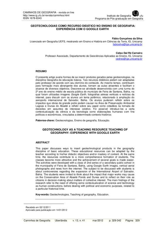 O presente artigo avalia formas de se inserir produtos gerados pelas geotecnologias, na disciplina Geografia da educação básica. Tais recursos didáticos podem ser adaptadas pelo professor de acordo com seu domínio do conteúdo. Ao mesmo tempo, contribuem para formação mais abrangente dos alunos, tornam as aulas atraentes e facilitam o alcance de diversos objetivos. Descreve-se atividade desenvolvida com uma turma do 2º ano do ensino médio de escola pública do município de Feira de Santana, Bahia, na qual foram utilizadas imagens Google Earth, fotografias aéreas verticais e notícias da internet, para discutir com os alunos um tema polêmico, relacionado á ampliação do aeroporto internacional de Salvador, Bahia. Os alunos puderam refletir sobre os impactos que obras de grande porte podem causar na Área de Preservação Ambiental Lagoas e Dunas do Abaeté e refletir sobre seu papel como cidadãos na tomada de decisões em assuntos de interesse coletivo. Foi possível introduzi-los a certa contextualização da ciência e da tecnologia como elaborações humanas com fins políticos e econômicos, vinculados a determinado contexto histórico.