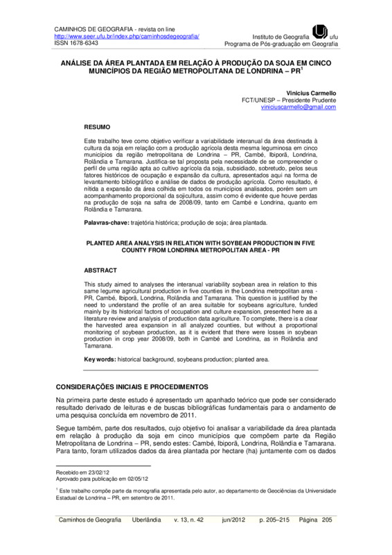 Este trabalho teve como objetivo verificar a variabilidade interanual da área destinada à cultura da soja em relação com a produção agrícola desta mesma leguminosa em cinco municípios da região metropolitana de Londrina – PR, Cambé, Ibiporã, Londrina, Rolândia e Tamarana. Justifica-se tal proposta pela necessidade de se compreender o perfil de uma região apta ao cultivo agrícola da soja, subsidiado, sobretudo, pelos seus fatores históricos de ocupação e expansão da cultura, apresentados aqui na forma de levantamento bibliográfico e análise de dados de produção agrícola. Como resultado, é nítida a expansão da área colhida em todos os municípios analisados, porém sem um acompanhamento proporcional da sojicultura, assim como é evidente que houve perdas na produção de soja na safra de 2008/09, tanto em Cambé e Londrina, quanto em Rolândia e Tamarana.