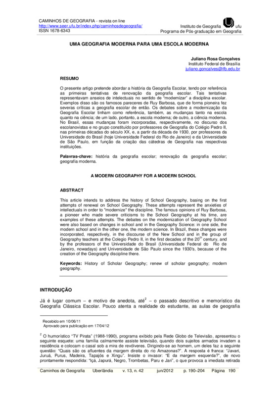 O presente artigo pretende abordar a história da Geografia Escolar, tendo por referência as primeiras tentativas de renovação da geografia escolar. Tais tentativas representavam anseios de intelectuais no sentido de “modernizar” a disciplina escolar. Exemplos disso são os famosos pareceres de Ruy Barbosa, que de forma pioneira fez severas críticas a geografia escolar de então. Os debates sobre a modernização da Geografia Escolar tinham como referência, também, as mudanças tanto na escola quanto na ciência; de um lado, portanto, a escola moderna; de outro, a ciência moderna. No Brasil, essas mudanças foram incorporadas, respectivamente, no discurso dos escolanovistas e no grupo constituído por professores de Geografia do Colégio Pedro II, nas primeiras décadas do século XX, e , a partir da década de 1930, por professores da Universidade do Brasil (hoje Universidade Federal do Rio de Janeiro) e da Universidade de São Paulo, em função da criação das cátedras de Geografia nas respectivas instituições.