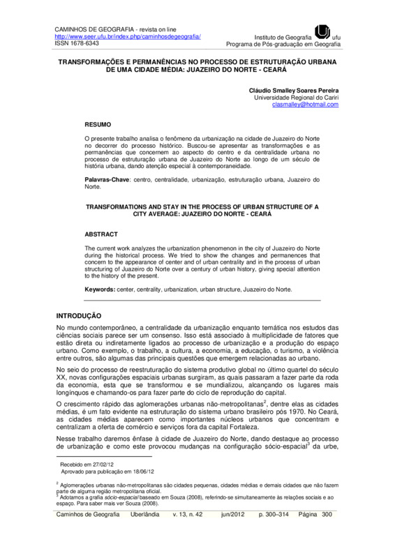 TRANSFORMAÇÕES E PERMANÊNCIAS NO PROCESSO DE ESTRUTURAÇÃO URBANA DE UMA CIDADE MÉDIA: JUAZEIRO DO NORTE - CEARÁ
