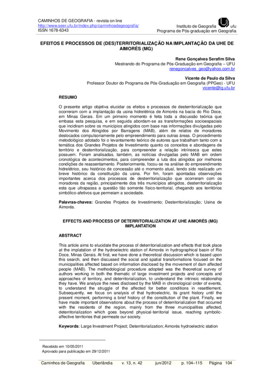 EFEITOS E PROCESSOS DE (DES)TERRITORIALIZAÇÃO NA IMPLANTAÇÃO DA UHE DE AIMORÉS (MG)