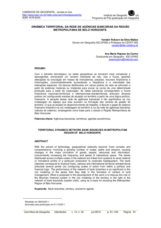 As redes bancárias correspondem a fluxos financeiros nacionais-territoriais e internacionais-extraterritoriais que articulam diversos pontos (re) configurando escalas de atuação no território. A atuação dessa rede de agências bancárias é tão significativa na (re) modelagem do espaço que ela auxilia na formação dos centros de gestão do território, ao mesmo tempo que essa rede é consolidada a partir de determinados fatores sociais, econômicos e políticos. O que se propõe no desenvolvimento do trabalho é discutir o papel do sistema financeiro brasileiro na (re) modelagem do território à luz da rede de agências bancárias (células do sistema) e identificar os fatores que norteiam a localização e a dinâmica das agências bancárias, empregando como base para o estudo a Região Metropolitana de Belo Horizonte. Para alcançar os objetivos que se propôs, utilizamos dados do IBGE sobre instituições financeiras e municípios, o estudo IBGE-Rede de influência das cidades de 2008 e relatórios do Banco Central. A partir dos estudos concluiu-se que a localização e dinâmica territorial das agências bancárias estão vinculadas à fatores de ordem econômica, demográfica, tecnológica e política e que a representatividade das agências no território brasileiro se multiplica a partir da utilização do território em rede, configurando espaços de fluxos territoriais e extraterritoriais.