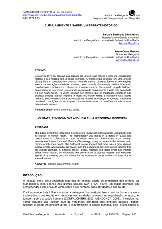 CLIMA, AMBIENTE E SAÚDE: UM RESGATE HISTÓRICO