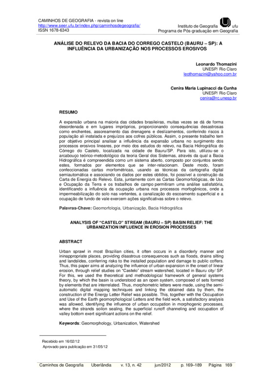 A expansão urbana na maioria das cidades brasileiras, muitas vezes se dá de forma desordenada e em lugares impróprios, proporcionando consequências desastrosas como enchentes, assoreamento das drenagens e deslizamentos, conferindo riscos à população ali instalada e prejuízos aos cofres públicos. Assim, o presente trabalho tem por objetivo principal analisar a influência da expansão urbana no surgimento dos processos erosivos lineares, por meio dos estudos do relevo, na Bacia Hidrográfica do Córrego do Castelo, localizada na cidade de Bauru/SP. Para isto, utilizou-se o arcabouço teórico-metodológico da teoria Geral dos Sistemas, através da qual a Bacia Hidrográfica é compreendida como um sistema aberto, composto por conjuntos sendo estes, formados por elementos que se inter-relacionam. Deste modo, foram confeccionadas cartas morfométricas, usando as técnicas da cartografia digital semiautomática e associando os dados por estes obtidos, foi possível a construção da Carta de Energia do Relevo. Esta, juntamente com as Cartas Geomorfológicas, de Uso e Ocupação da Terra e os trabalhos de campo permitiram uma análise satisfatória, identificando a influência da ocupação urbana nos processos morfogênicos, onde a impermeabilização do solo nas vertentes, a canalização do escoamento superficial e a ocupação de fundo de vale exercem ações significativas sobre o relevo.