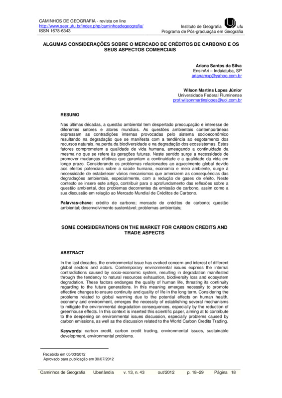 Nas últimas décadas, a questão ambiental tem despertado preocupação e interesse de diferentes setores e atores mundiais. As questões ambientais contemporâneas expressam as contradições internas provocadas pelo sistema socioeconômico resultando na degradação que se manifesta com a tendência ao esgotamento dos recursos naturais, na perda da biodiversidade e na degradação dos ecossistemas. Estes fatores comprometem a qualidade de vida humana, ameaçando a continuidade da mesma no que se refere às gerações futuras. Neste sentido surge a necessidade de promover mudanças efetivas que garantam a continuidade e a qualidade da vida em longo prazo. Considerando os problemas relacionados ao aquecimento global devido aos efeitos potenciais sobre a saúde humana, economia e meio ambiente, surge à necessidade de estabelecer vários mecanismos que amenizem as consequências das degradações ambientais, especialmente, com a redução de gases de efeito. Neste contexto se insere este artigo, contribuir para o aprofundamento das reflexões sobre a questão ambiental, dos problemas decorrentes da emissão de carbono, assim como a sua discussão em relação ao Mercado Mundial de Créditos de Carbono.