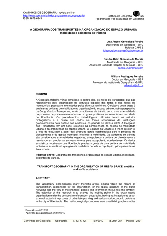 A Geografia trabalha várias temáticas, e dentre elas, os meios de transportes, que são responsáveis pela organização da estrutura espacial das redes e dos fluxos de mercadorias, pessoas e informações pelos diversos territórios. Nesse sentido, o objetivo desta pesquisa é analisar as políticas de mobilidade na organização do espaço urbano, sob a perspectiva da Geografia dos Transportes, tendo os acidentes de trânsito como uma externalidade no processo de planejamento urbano e um grave problema socioeconômico na cidade de Uberlândia. Assim, na operacionalização do mesmo, foram realizados alguns procedimentos metodológicos, tais como estudos bibliográficos e coleta dos dados em fontes secundárias de instituições governamentais para análise dos acidentes, no período de 2006 a 2009. Na organização do espaço urbano, a Geografia dos Transportes é uma disciplina importante para a compreensão da política de mobilidade urbana. O Estatuto da Cidade regulamentou os artigos 182 e 183 da Constituição Federal e estabeleceu diretrizes gerais para a política urbana brasileira e o Plano Diretor é um instrumento que traça as diretrizes gerais para o planejamento municipal. Os acidentes de trânsito podem ser considerados externalidades negativas nesse espaço urbano organizado, uma vez que extrapolam a política de planejamento e resultam em problemas econômicos e sociais para a população uberlandense. Em suma, as estatísticas dos acidentes de trânsito ainda assustam, e por esse motivo, o Brasil, Minas Gerais e Uberlândia precisam urgente de uma política de mobilidade inclusiva e sustentável, que garanta qualidade de vida à população, principalmente nas áreas urbanas.