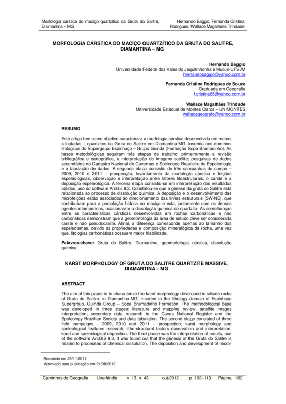 MORFOLOGIA CÁRSTICA DO MACIÇO QUARTZÍTICO DA GRUTA DO SALITRE, DIAMANTINA – MG