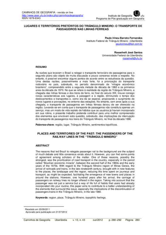 As razões que levaram o Brasil a relegar o transporte ferroviário de passageiros para o segundo plano são objeto de muita discussão e pouco consenso existe a respeito. No entanto, é possível encontrar alguns pontos de acordo entre os estudiosos da questão. Uma destas razões, possivelmente a mais forte, foi a priorização do transporte rodoviário no país, sobretudo, no período denominado de “milagre econômico brasileiro”, compreendido entre a segunda metade da década de 1960 e os primeiros anos da década de 1970. No que se refere à realidade da região do Triângulo Mineiro, a chegada das linhas férreas e dos trens de ferro, no final do século XIX, trouxe consigo novas características aos lugares, à paisagem e à região, diminuindo o tempo dos deslocamentos e transportes e, como era de se esperar, propiciando o surgimento de novos lugares e povoações, no entorno das estações. No entanto, cem anos após a sua chegada, o transporte de passageiros em linhas férreas deixou de ser oferecido na região. Levando-se em conta que o transporte de passageiros não constituía apenas um serviço, mas um modo de vida repleto de hábitos que os usuários já haviam incorporado em sua rotina, o presente trabalho pretende contribuir para uma melhor compreensão dos elementos que envolvem esta questão, sobretudo, das implicações da interrupção do transporte de passageiros nos trens do Triângulo Mineiro, no final da década 1990.